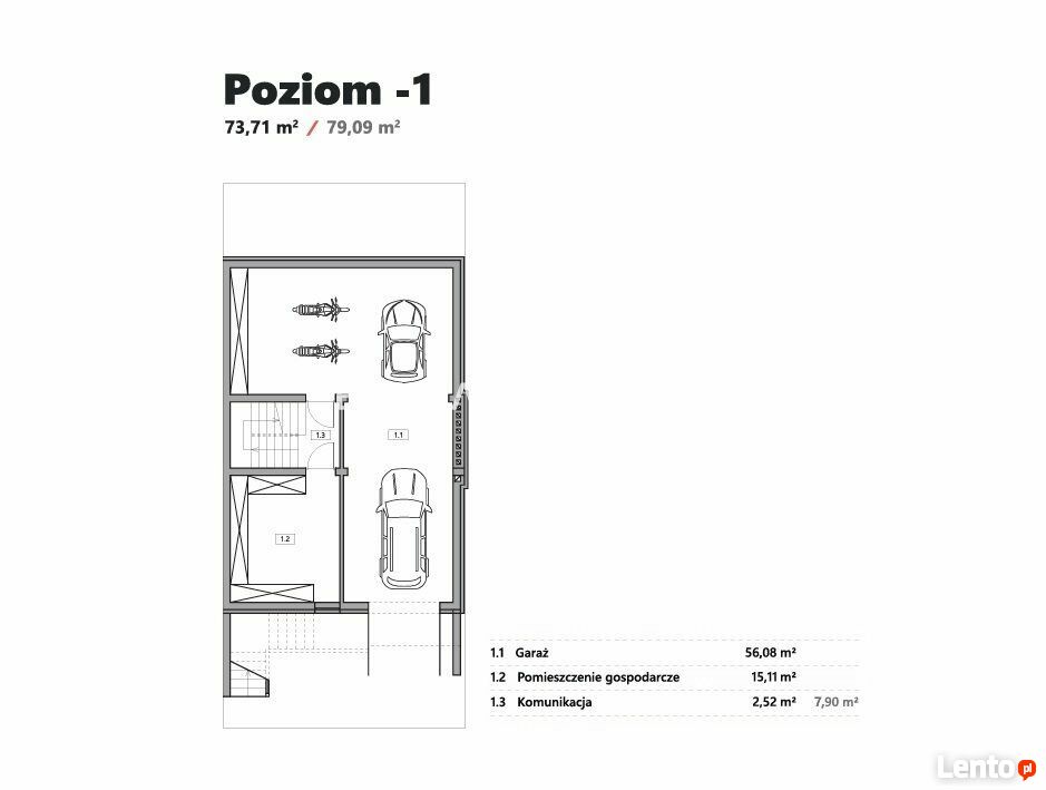 Łączna powierzchnia poziomu -1: 73,71 m²