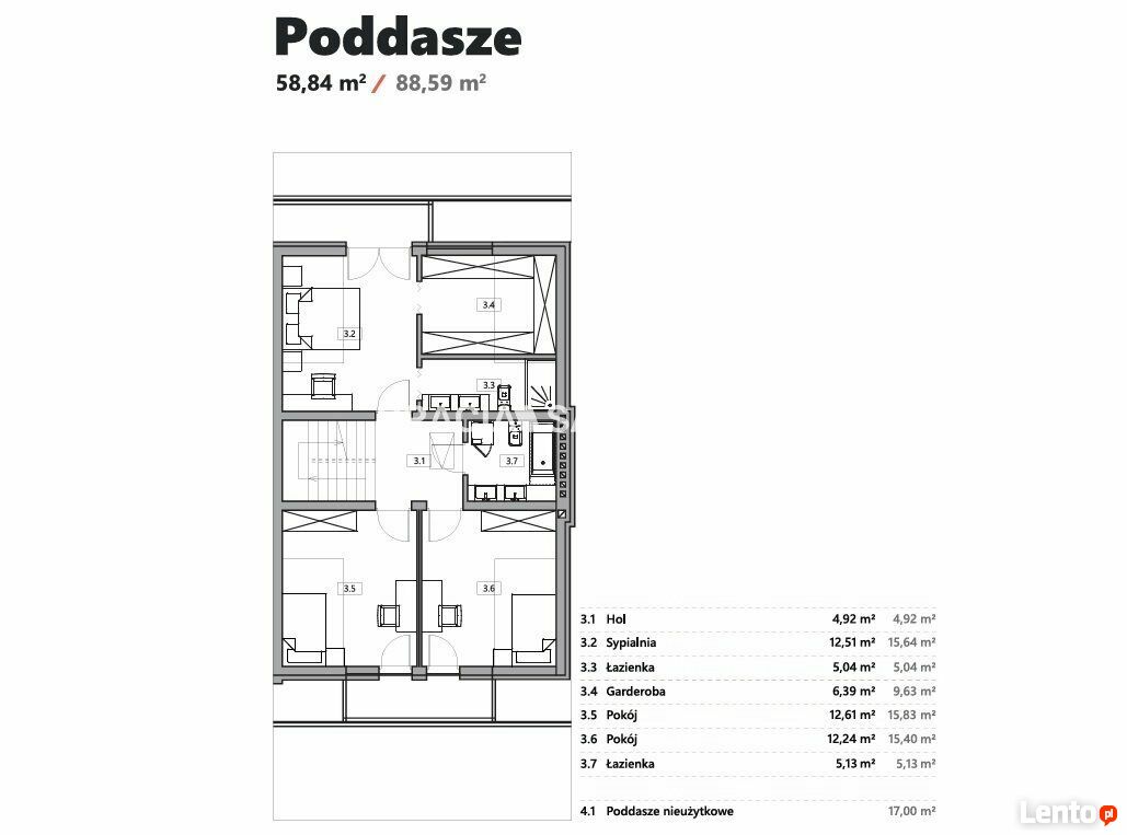 • 4.1 Poddasze nieużytkowe: 17,00 m²